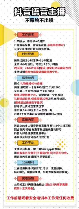 诚招抖音语音主播(居家不露脸)1、jiamzhi3小时(三小时连播 )全职6小时...
